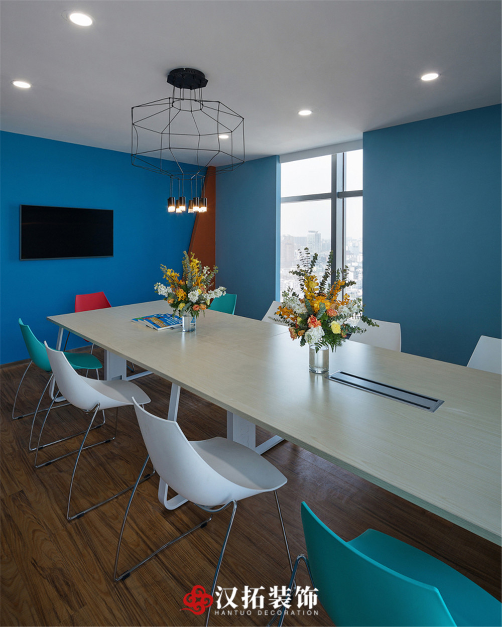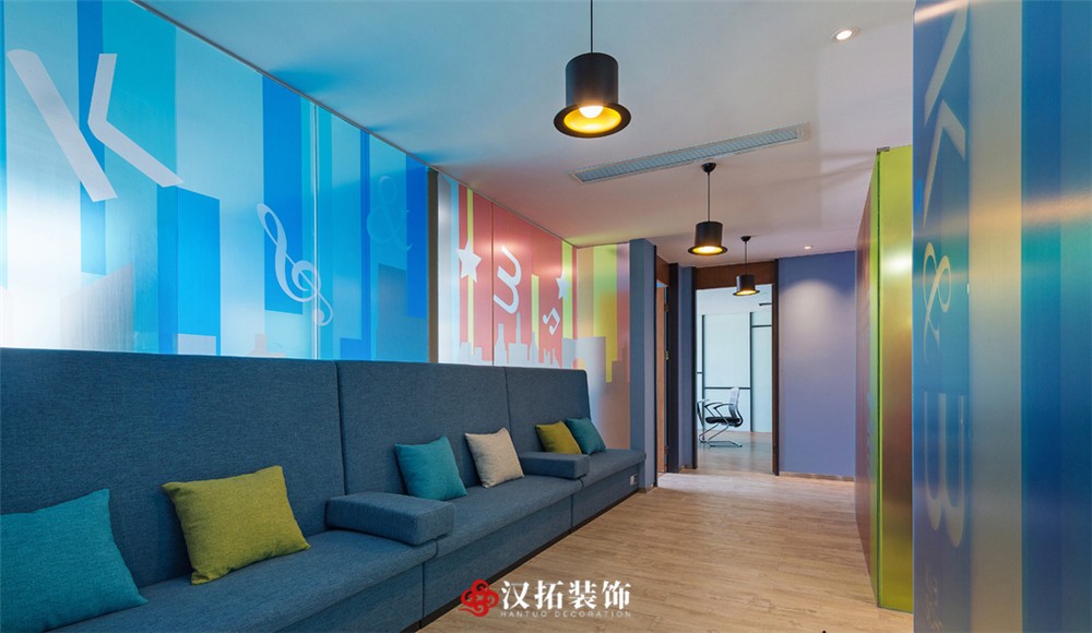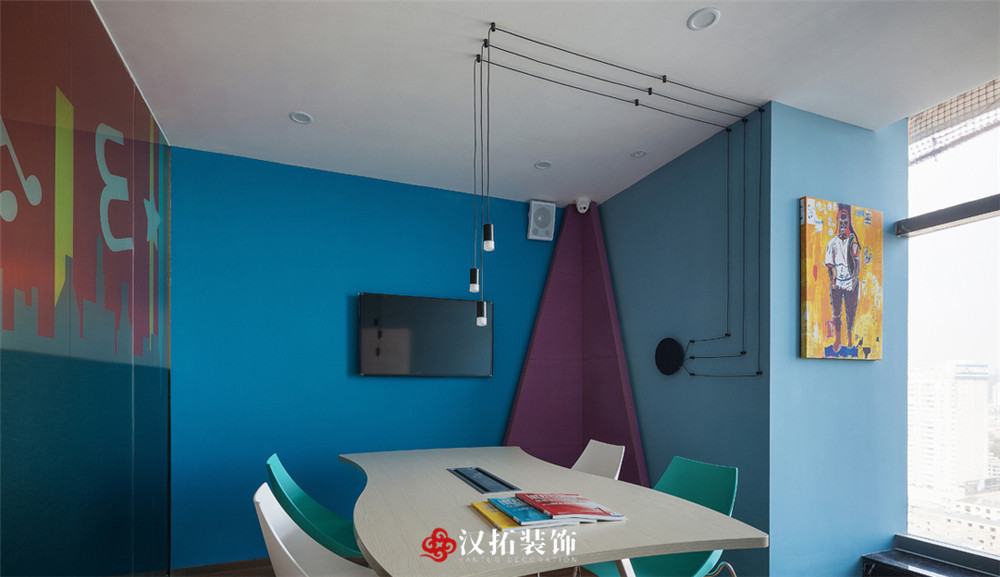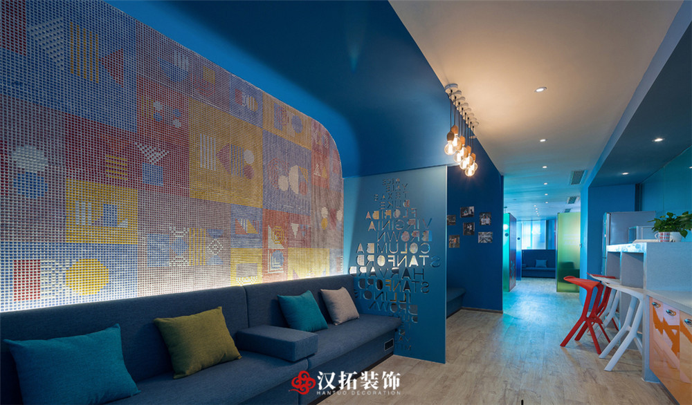 設(shè)計(jì)說明:整個(gè)空間以藍(lán)色為主色調(diào),將其他顏色嵌入其中,打造出一種小清新的自然感,讓人心情愉悅舒適。光線明亮,整體富有層次感,簡約溫馨。
