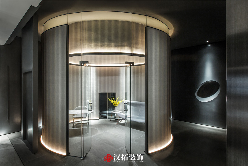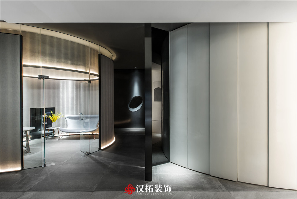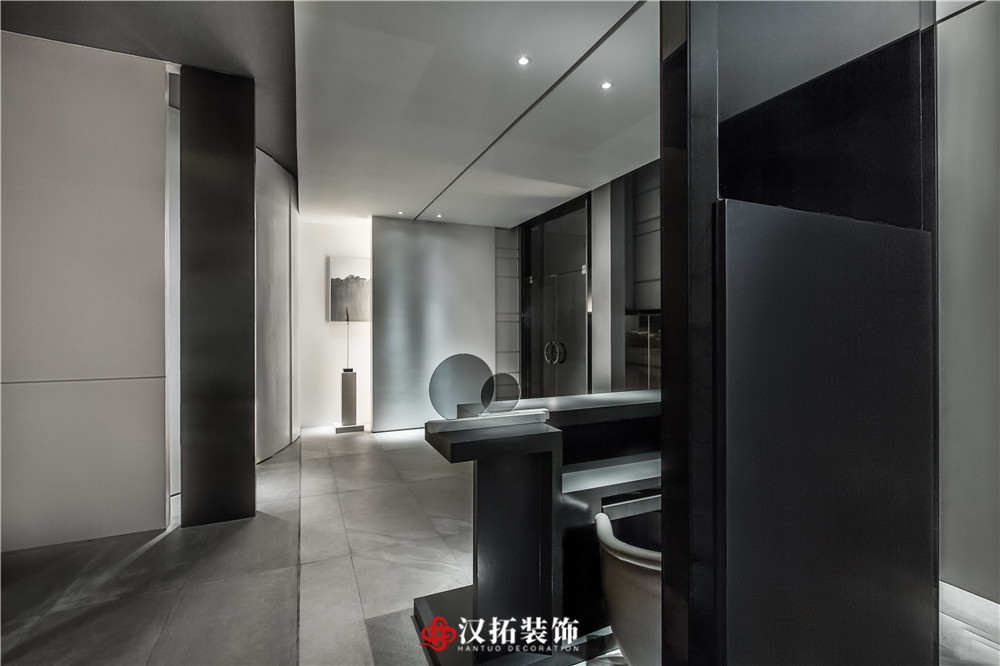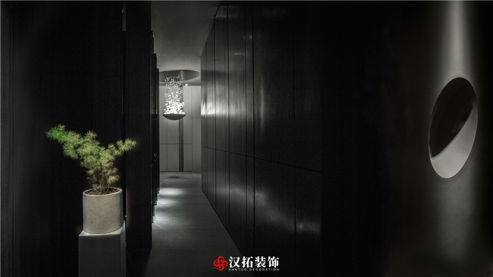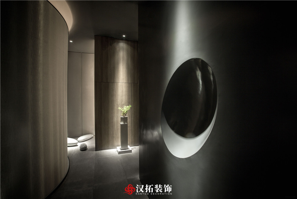設(shè)計(jì)說明:為了突出空間的縱深感,從入口處這個(gè)位置開始,把視覺壓的很低,留出一點(diǎn)借景窗,引人進(jìn)入到內(nèi)部空間,這里通過對(duì)比,黑白,高低設(shè)計(jì)體量的控制,通過這種平、框、曲、長,中國園林的手法,把整個(gè)空間該有的視覺若隱若現(xiàn)的控制在這里。