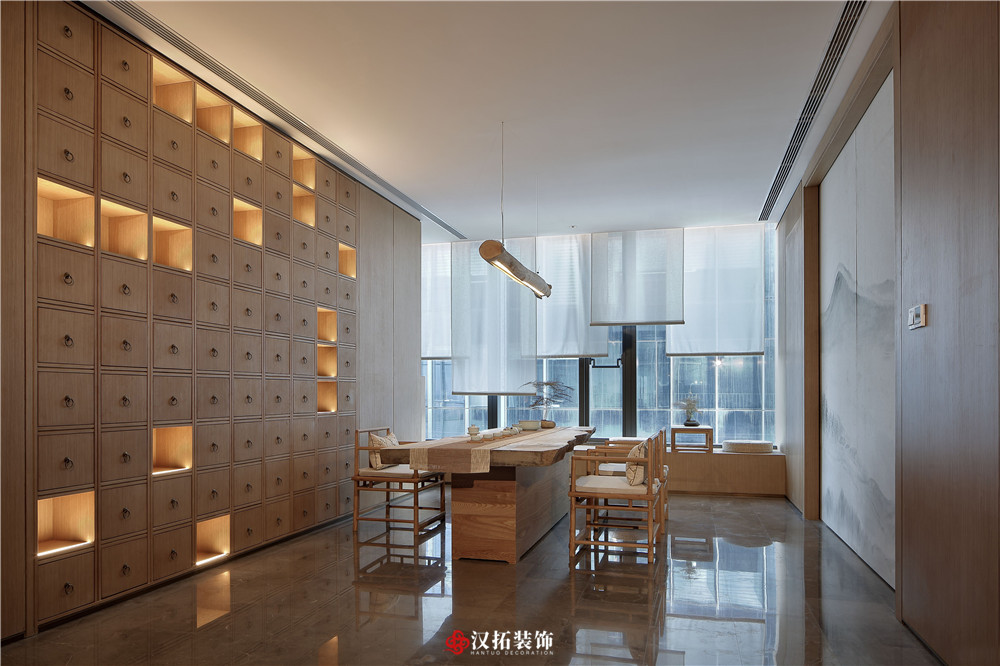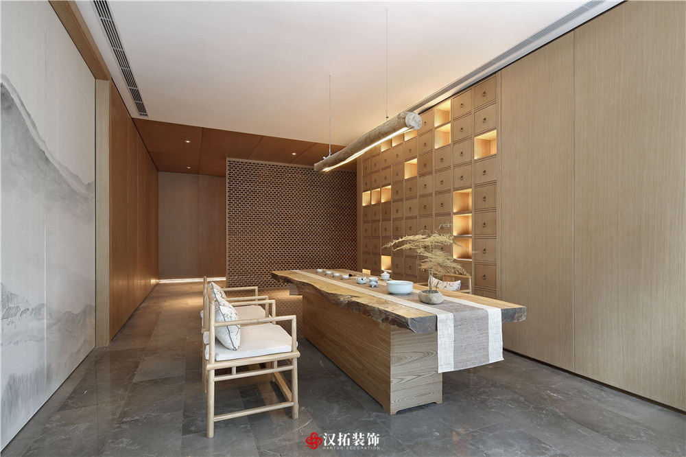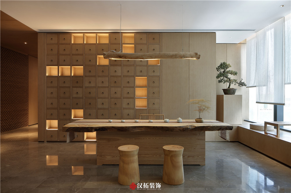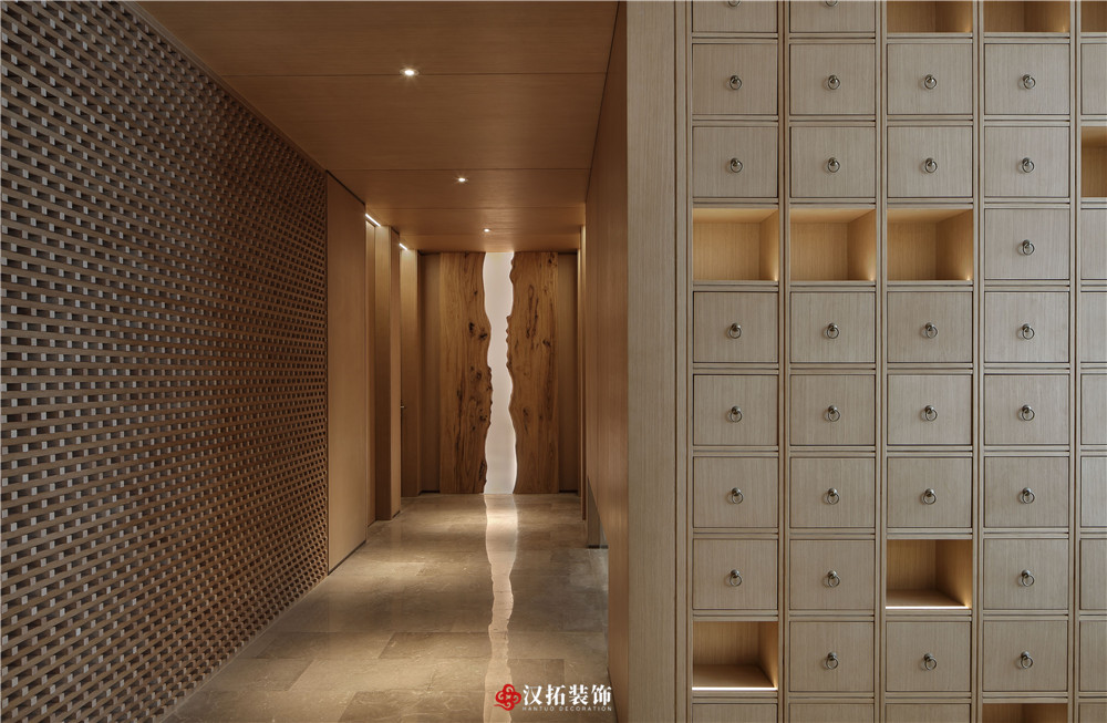 設(shè)計說明:本案材料簡單,色調(diào)樸素,造一片凈土,尋一處安靜,使身心得到放松。在這里,原木色的墻板配上深灰色的石材,中醫(yī)的藥柜整齊地羅列著,空間彌漫著淡淡的中式味,卻找不到傳統(tǒng)的中式元素,達(dá)到了有意無形。