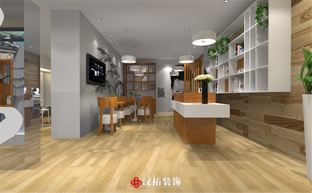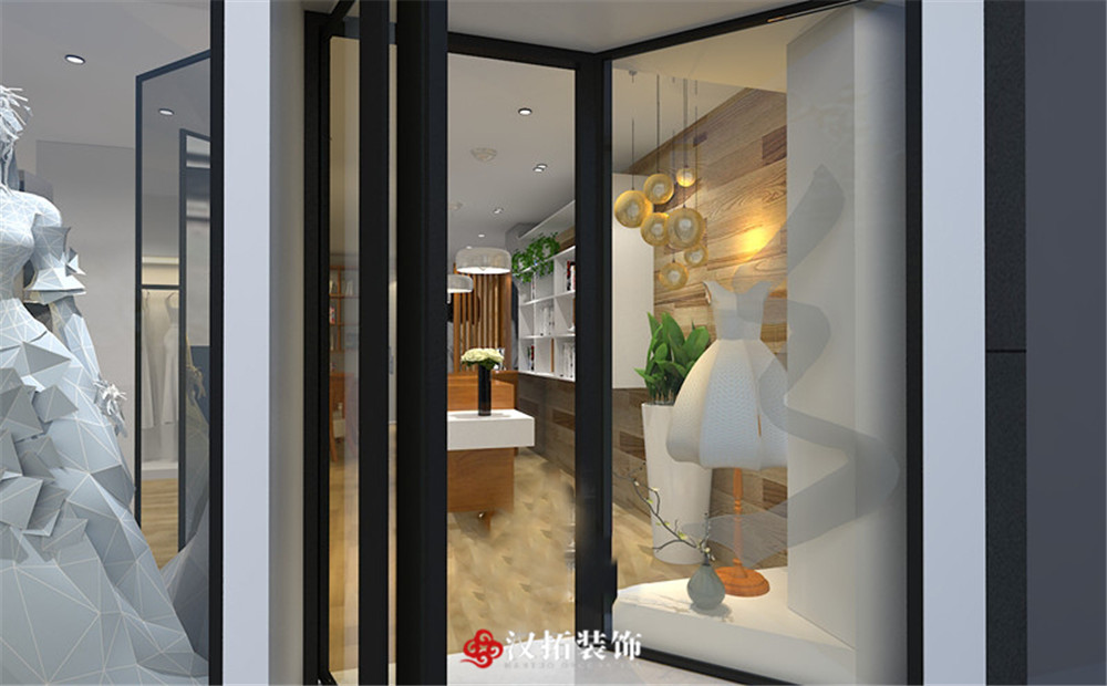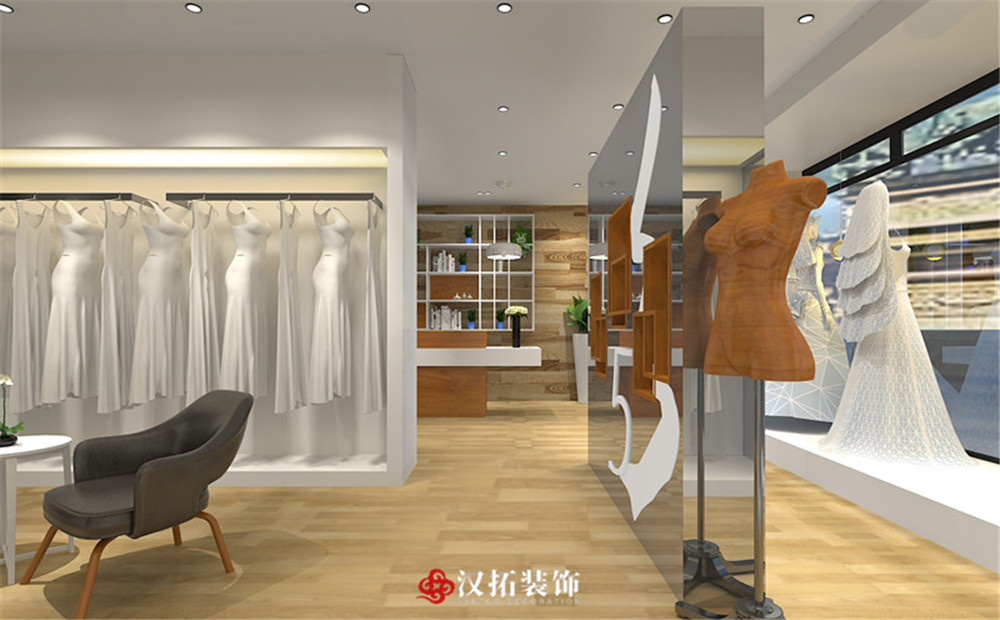設計說明:整個婚紗店以白色為主色調,與木質地板相融合,家具也都是淺色調,簡潔大方,給客戶一種清新自然的感覺,光線明亮,整個空間的利用率很高。