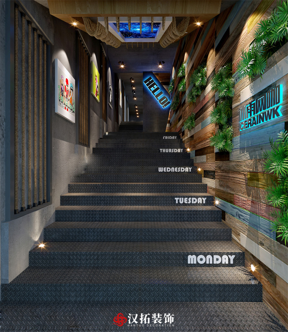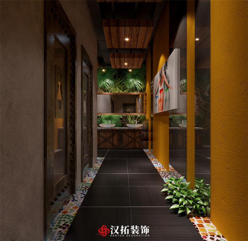 設(shè)計(jì)說(shuō)明:地面是以灰色的防滑地板為主,桌子也運(yùn)用了深木色,燈光的設(shè)計(jì)勻稱整體色彩的布局。墻面采用大量壁畫與主題裝飾,給人身臨其境的感覺(jué)。