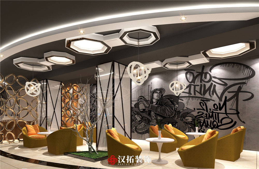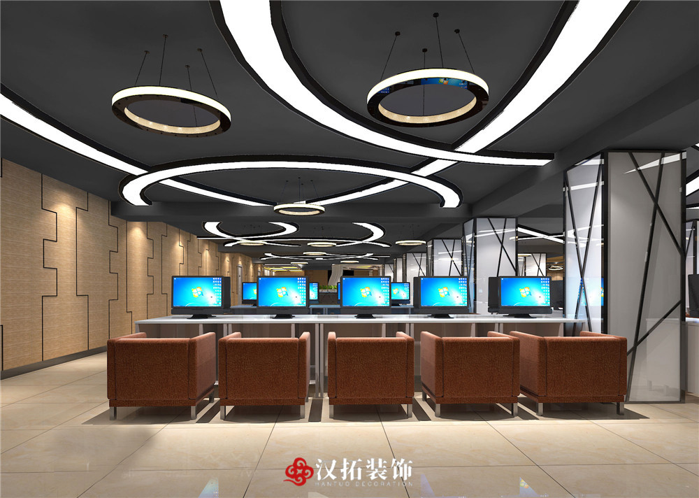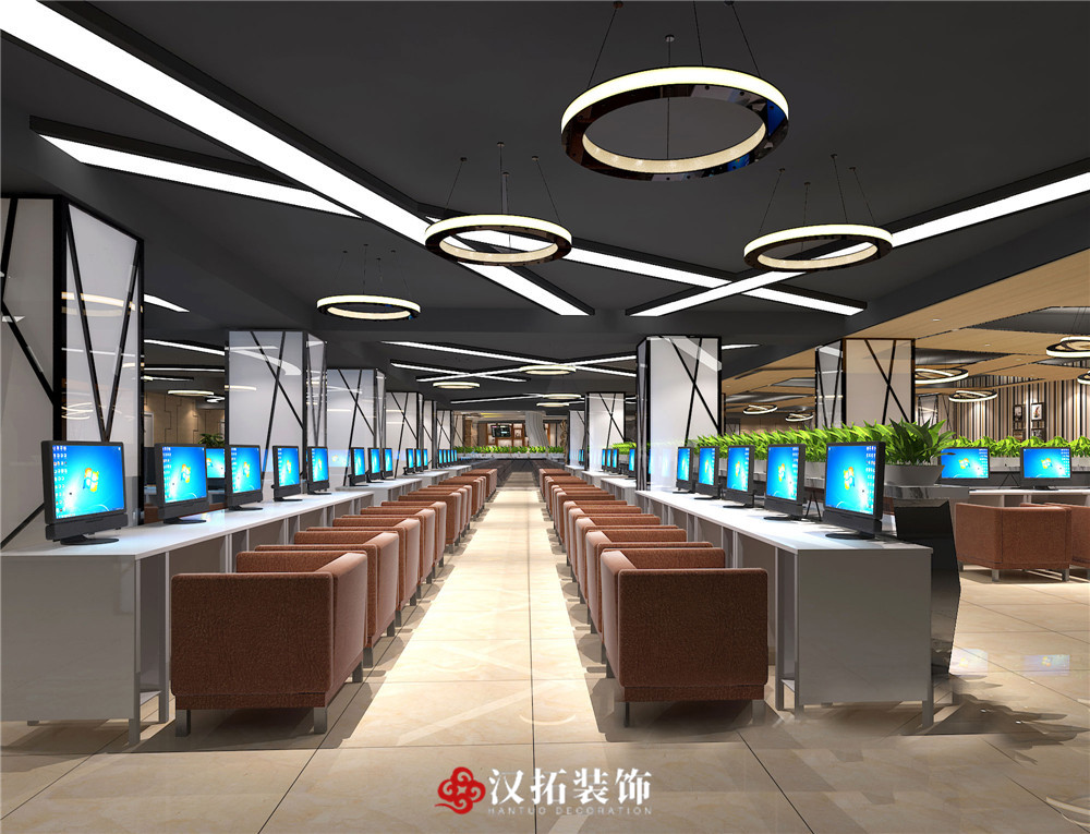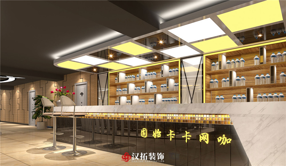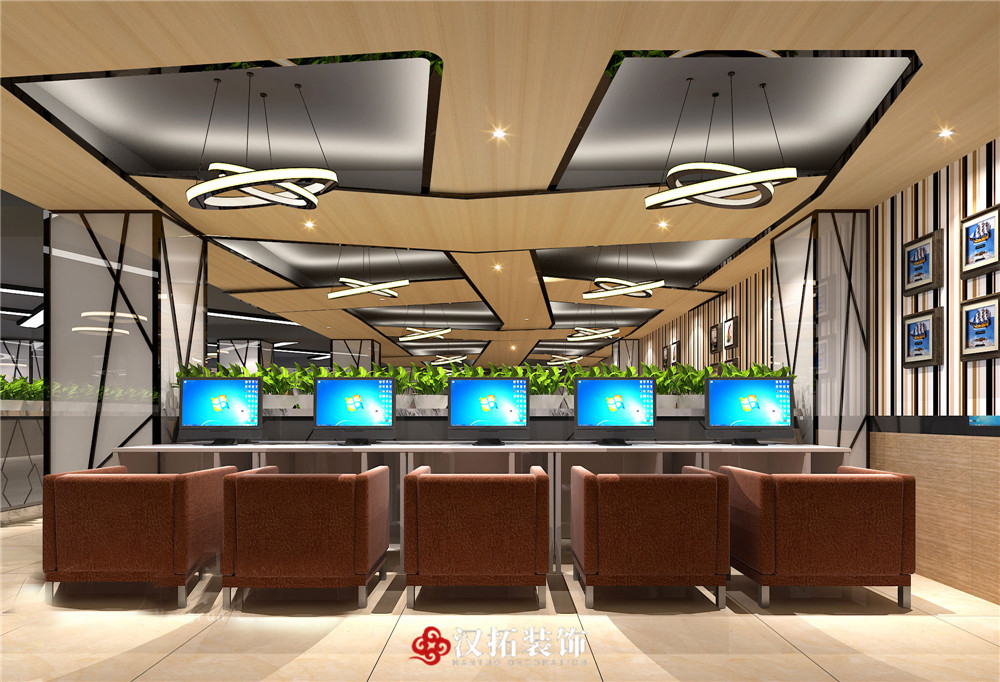 設計說明:吧臺簡潔大方,整個網咖色調統(tǒng)一,凸顯了網咖的現(xiàn)代和大氣。休息區(qū)進行了切割改造,設計感比較強。整體采光和通風都比較合適,給人舒適愉悅的感覺。