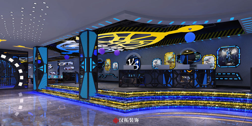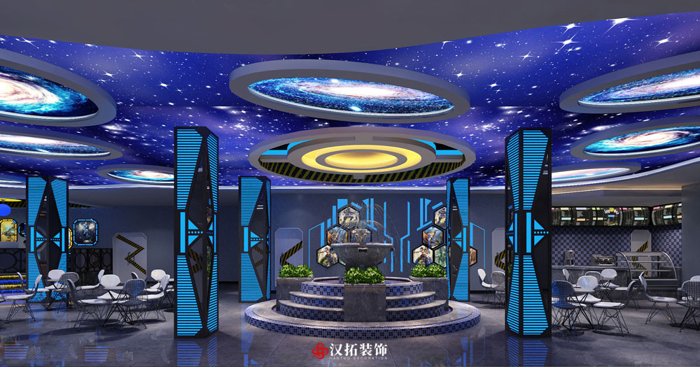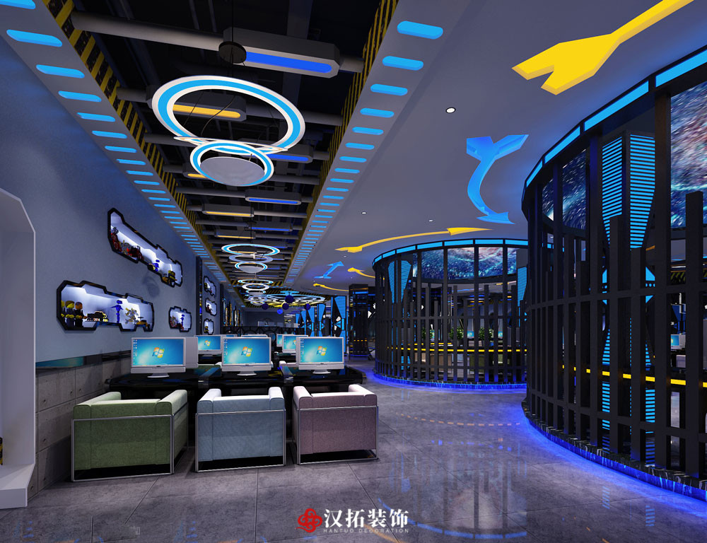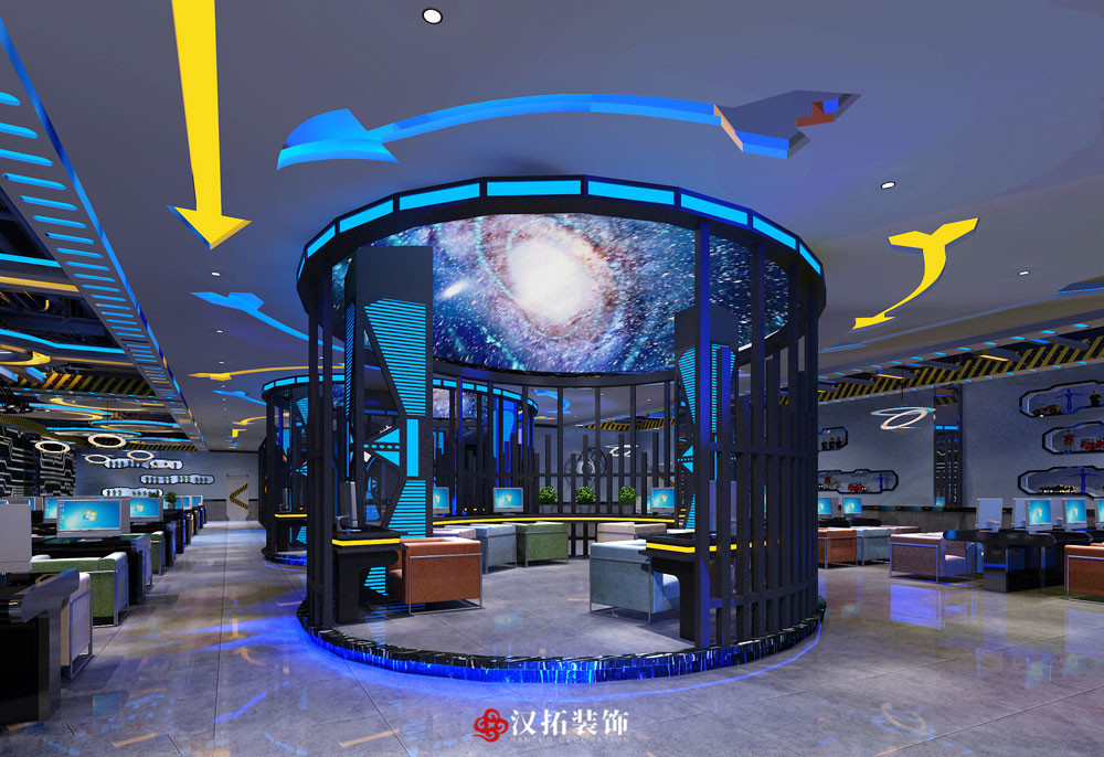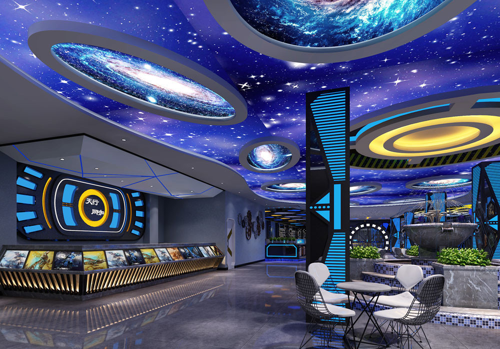 設(shè)計(jì)說(shuō)明:科技風(fēng)網(wǎng)咖,以星空宇宙為主題,通過(guò)對(duì)燈光和頂面的設(shè)計(jì),選用藍(lán)色為主色調(diào),將整個(gè)空間烘托出動(dòng)感時(shí)尚的氛圍。