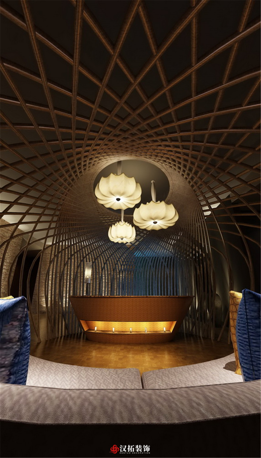 設計說明:按照功能區(qū)進行設計劃分,整個大廳光線通透明亮,體現(xiàn)高級現(xiàn)代感,包廂優(yōu)雅舒適,光線偏暗,打造休閑愜意環(huán)境氛圍。整體現(xiàn)代和泰式相結合,靈動且精致。