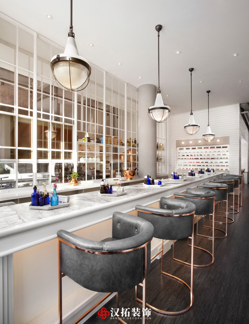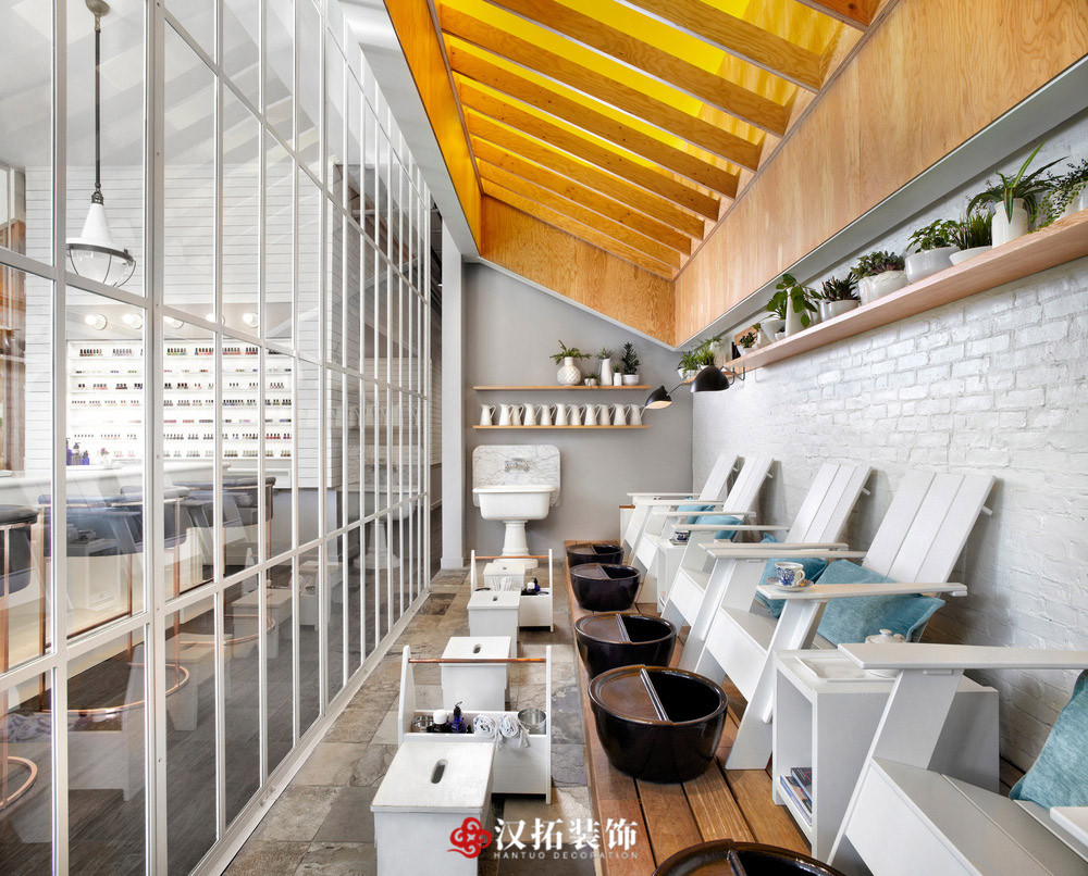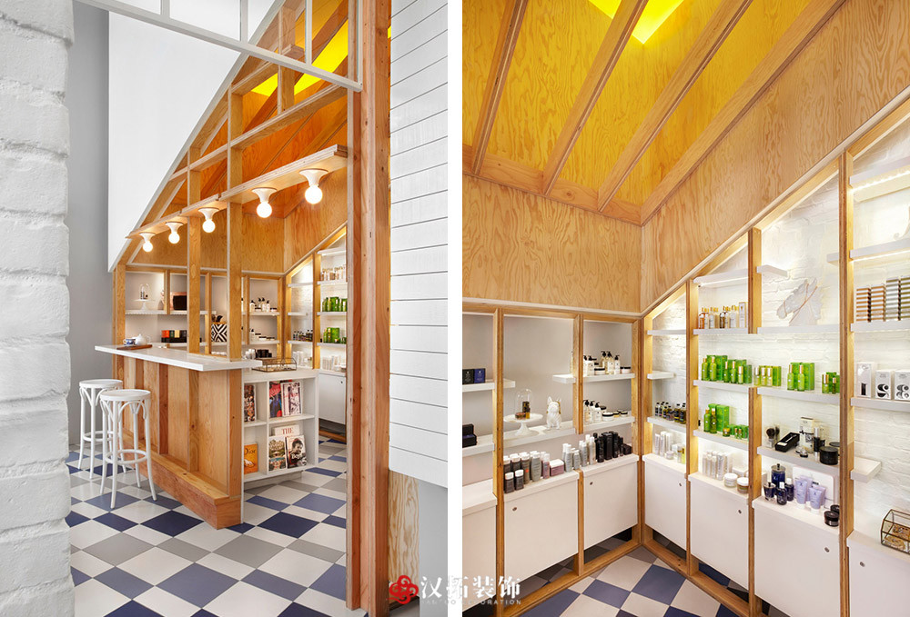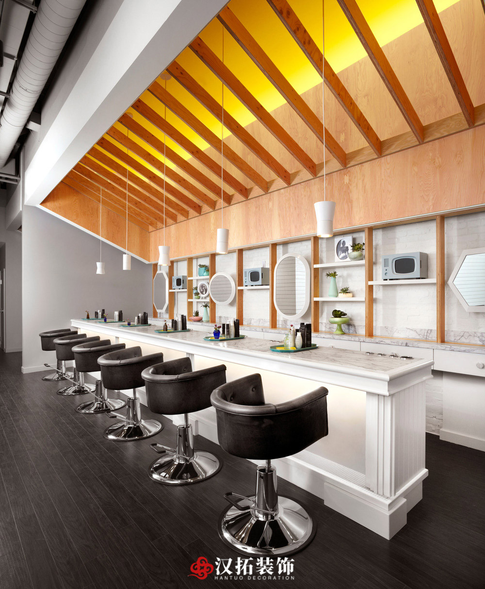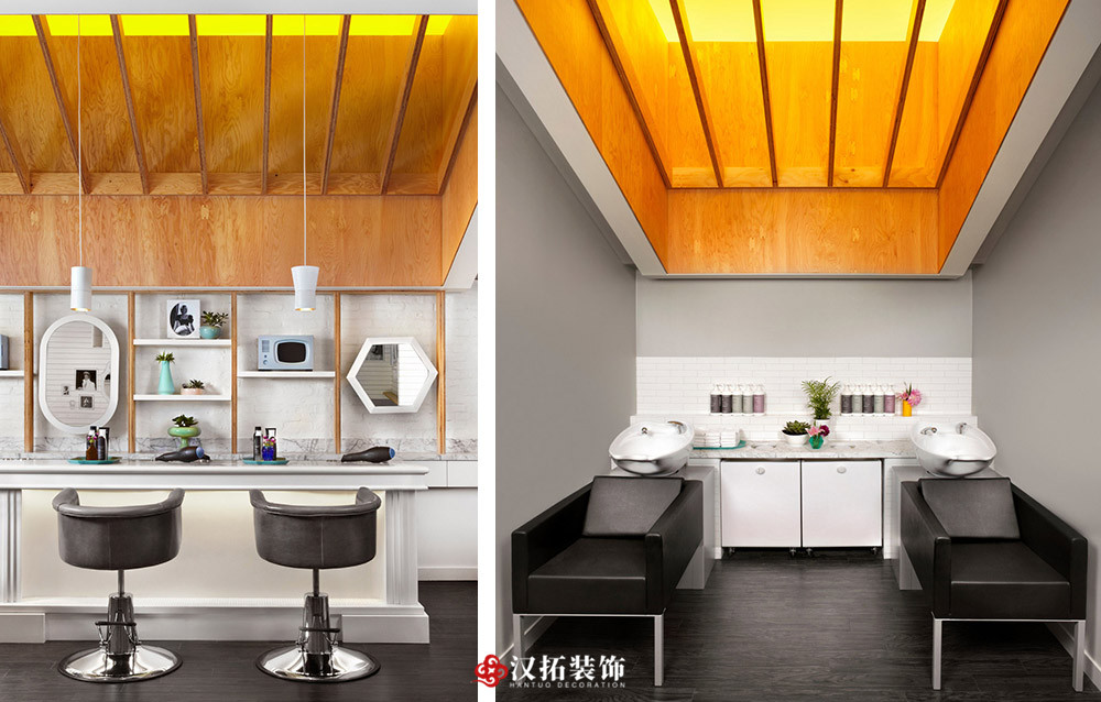 設計說明:店鋪內(nèi)的主色調(diào)選擇比較輕快明了的色彩,頂部使用大面積的明黃,使得空間更加跳躍活潑,增加通透感,店內(nèi)工具擺放整齊,干凈又美觀。