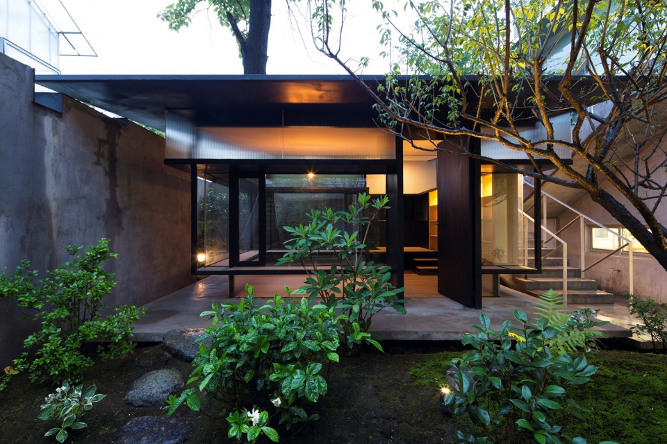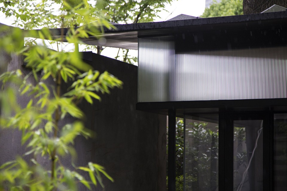 設(shè)計(jì)說(shuō)明:一棵高高的泡桐樹,樹下院內(nèi)擬修茶室一座。不大的院子里還有兩個(gè)和旁邊辦公樓相連的樓梯,如何讓茶室最小限度地侵占院子的空間,是設(shè)計(jì)的一個(gè)重點(diǎn)。
