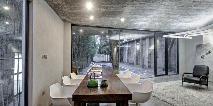 裝修理念:基地本身極為局促,三向面墻,只有一個(gè)方向朝向一個(gè)有水池的后院,同時(shí)整個(gè)建筑對(duì)空間的索取也因?yàn)楝F(xiàn)有的一顆大樹(shù)而受到很大限制,而設(shè)計(jì)的結(jié)果也表現(xiàn)為一種綜合了封閉與開(kāi)敞、占有與妥協(xié)、趣味空間與邏輯建造等多種復(fù)雜關(guān)系之后的一種和諧。整個(gè)建筑貼合基地空間,平面布局呈現(xiàn)為一個(gè)邏輯關(guān)系模糊的四邊形,卻也因此獲得了對(duì)空間的最大索取。整個(gè)建筑在布局上分為三部分,朝向后院一側(cè)布置相對(duì)公共性的開(kāi)敞空間,一層茶室,二層圖書(shū)室,同時(shí)在二層圖書(shū)室伸出一個(gè)三角型的小平臺(tái)將現(xiàn)存樹(shù)木加以包裹,使得樹(shù)木和建筑本身融為一體。而背向后院一側(cè)布置休息室,書(shū)房以及輔助服務(wù)空間等相對(duì)私密的空間;公共空間與私密空間之間通過(guò)一個(gè)趣味性的連接空間得以串連。