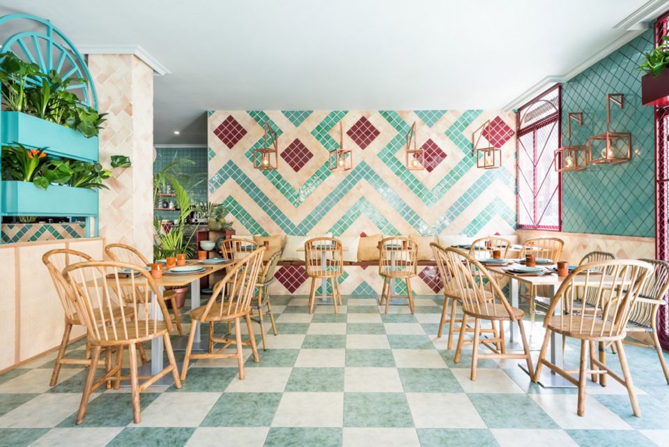 設(shè)計說明:該餐廳是由南京漢拓裝飾工程有限公司裝修的。該店的定位是做休閑餐廳,因此設(shè)計師對于該店的設(shè)計十分到位,整個基調(diào)充滿了異域風(fēng)情,從主色調(diào)就可以看出,選用的是翡翠綠和櫻桃紅的結(jié)合,顏色飽滿、很有張力,讓人充滿幻想,背景墻使用了馬賽克小方磚進(jìn)行鋪設(shè)裝飾,風(fēng)格自成一體。燈具采用了造型夸張的金屬框造型,掛在墻面與室內(nèi)設(shè)計融為一體。地磚的顏色稍淺,整個餐廳顯得干凈、清爽.......軟裝綠植選用了熱帶植物,視覺上與室內(nèi)設(shè)計風(fēng)格一致。