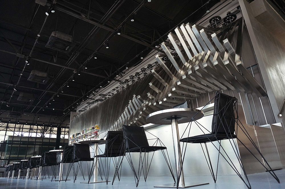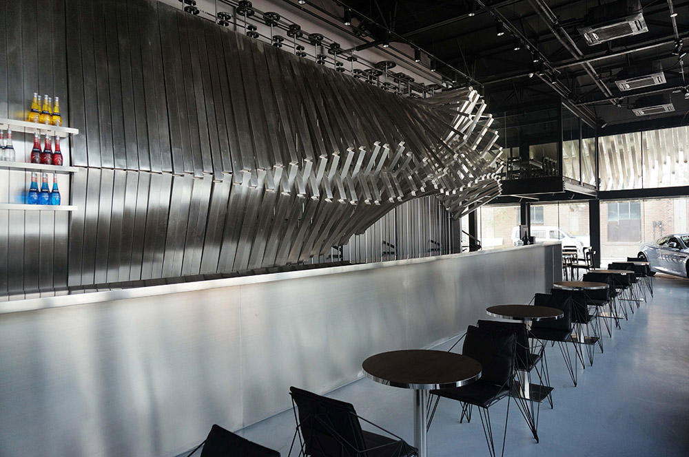 設(shè)計說明:該咖啡廳是由南京漢拓裝飾工程有限公司裝修的。該咖啡廳的定位就是酷炫,對于設(shè)計師的要求是結(jié)合工業(yè)現(xiàn)代元素,又要有智能化商業(yè)元素的糅合,設(shè)計師的基調(diào)是工業(yè)的金屬質(zhì)感,對于材質(zhì)的選材十分講究,塑造了十分硬朗的風(fēng)格,利用金屬材質(zhì)的反光特性,既制造了朦朧的映像,又可以反射光線在室內(nèi),斑駁的光感有別于其他咖啡館的模式。